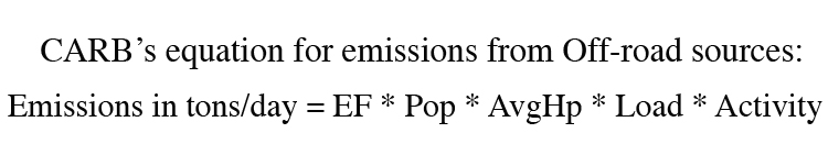 The model uses a typical equation for predicting off-road emissions from a source. This equation is similar but slightly more detailed than the simple equation 6.3.9-1 (seen here and earlier), since it accounts for the load factor. ARB uses the same equation as presented in equation 6.3.9-2 for the detailed emissions estimation of off-road sources.